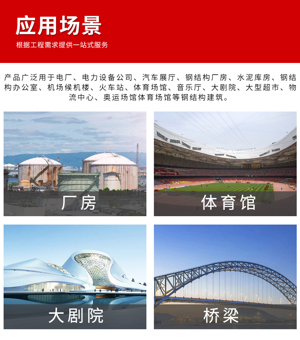 本產(chǎn)品具有自重輕、強(qiáng)度高、鋼度大、防腐性好、抗震性強(qiáng)、耐火性佳、施工便捷、易于更新,同時(shí)符合國家倡導(dǎo)的節(jié)能、環(huán)保、安全要求。