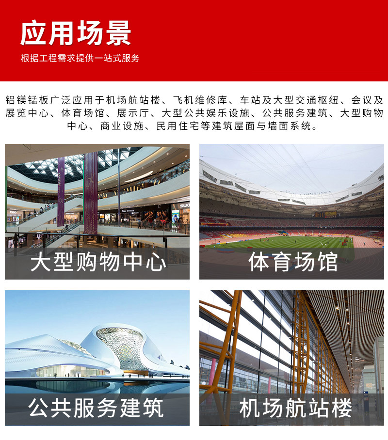 一、關(guān)于鋁鎂錳板的簡介:具有耐腐蝕、美觀、重量輕、強度大、容易加工成型等諸多優(yōu)點,廣泛應(yīng)用于機場航站樓、飛機維修庫、車站及大型交通樞紐、會議及展覽中心、體育場館、展示廳、大型公共娛樂設(shè)施、公共服務(wù)建筑、大型購物中心、商業(yè)設(shè)施、民用住宅等建筑。